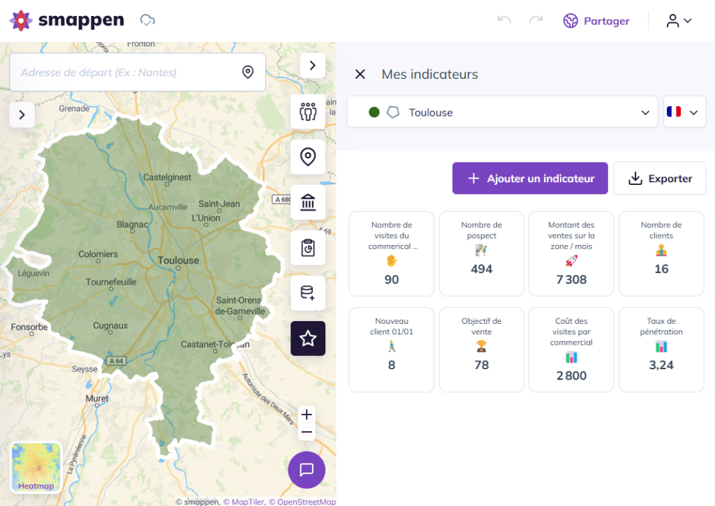 Vous gérez une équipe de commerciaux répartis sur plusieurs départements. Grâce à la fonctionnalité Mes indicateurs de Smappen, vous pouvez visualiser en un clin d’œil :