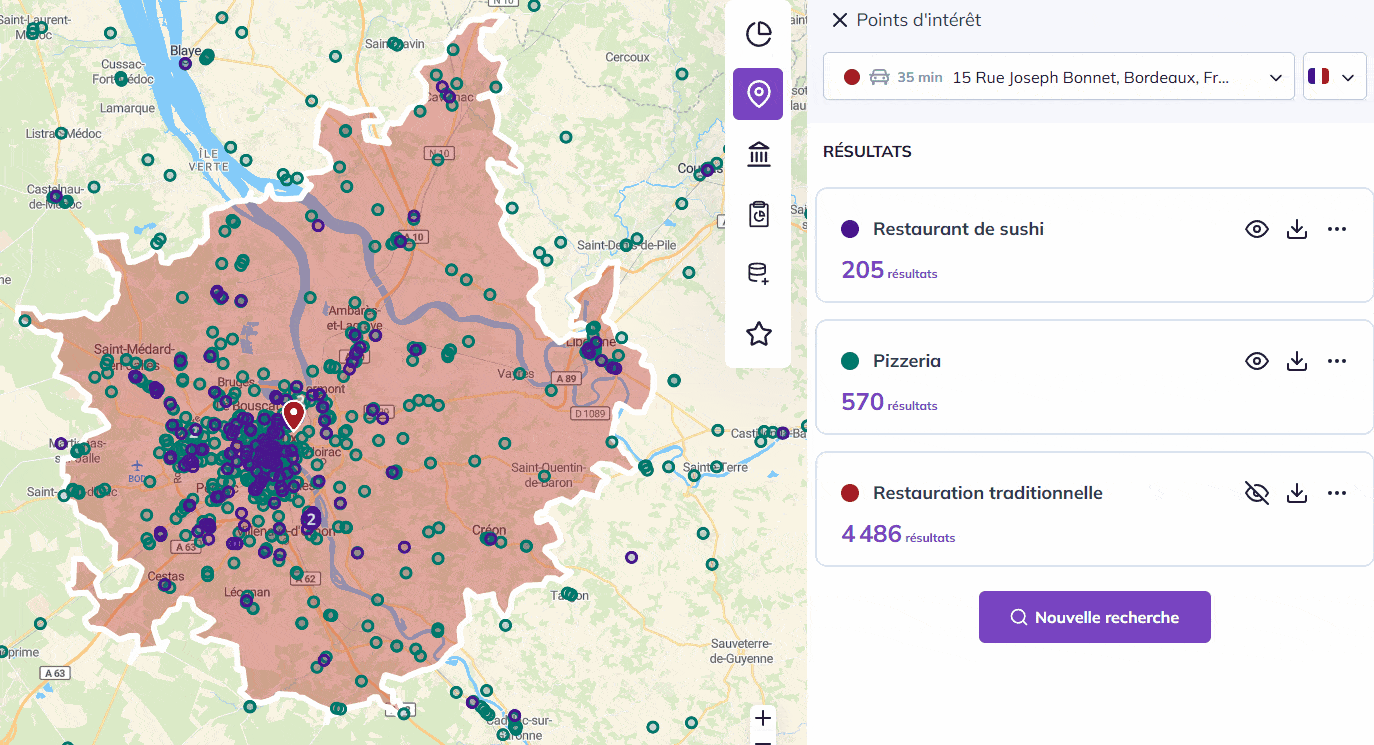 NB : les résultats s’affichent toujours sur l’ensemble de la carte, et non uniquement sur la zone. Cela permet d’avoir une vision plus globale du nombre de concurrents aux alentours et, si nécessaire, d’ajuster la zone.