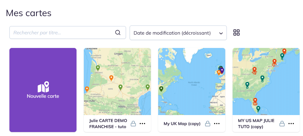 Recherche et tri : Dans ce menu, vous pouvez également rechercher une carte par son titre ou trier vos cartes par date de création ou de modification.
