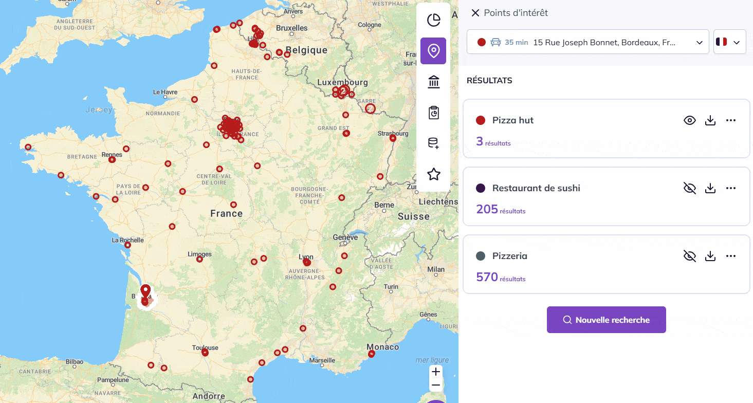 Pour changer l’aspect des points d’une recherche entreprise cliquez sur le bouton « Points d’intérêts » du panneau des analyses et données :