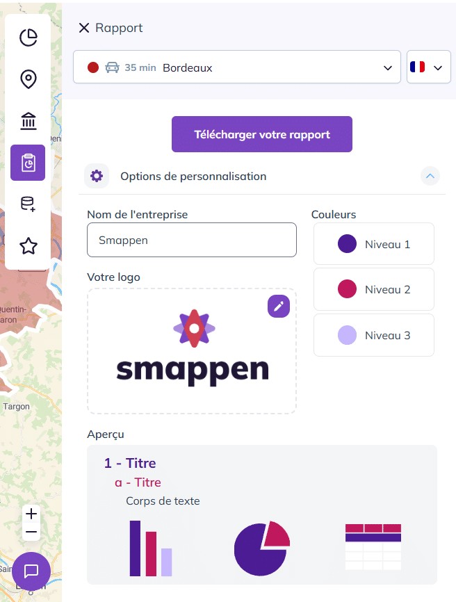 Une fois vos zones et vos recherches configurées, vous pouvez générer un rapport complet, appelé État local de marché. Disponible au format Word, ce rapport reprend les informations démographiques disponibles dans l’app et les recherches entreprises, préalablement paramétrées sur une zone.