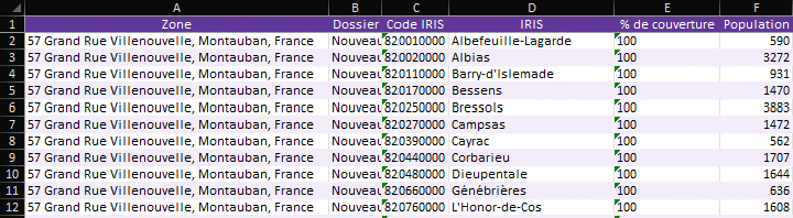 Avec le plan Avancé, une fois vos indicateurs programmés, vous pouvez exporter leurs résultats sur toutes les zones de votre carte en un seul fichier Excel afin de les comparer en un clin d’oeil.