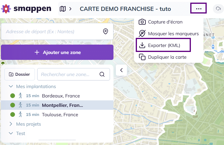 Smappen vous permet d’exporter l’ensemble des zones de votre carte dans un fichier KML unique, compatible avec de nombreux outils de cartographie (SIG, CRM, etc.).