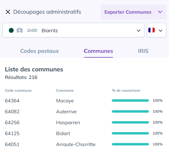 Astuce : le pourcentage affiché pour chaque commune correspond à la part de sa surface incluse dans la zone sélectionnée.