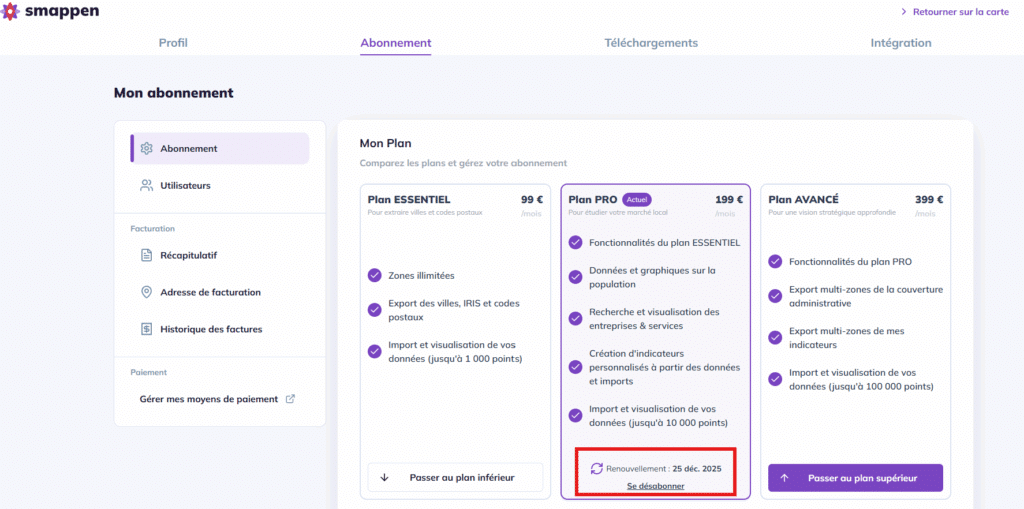 Vous pouvez gérer votre abonnement directement dans smappen, afin de :