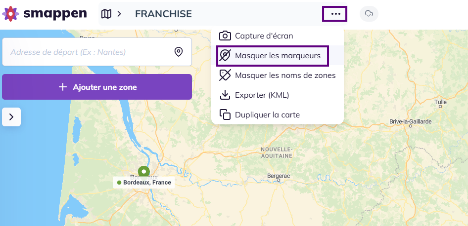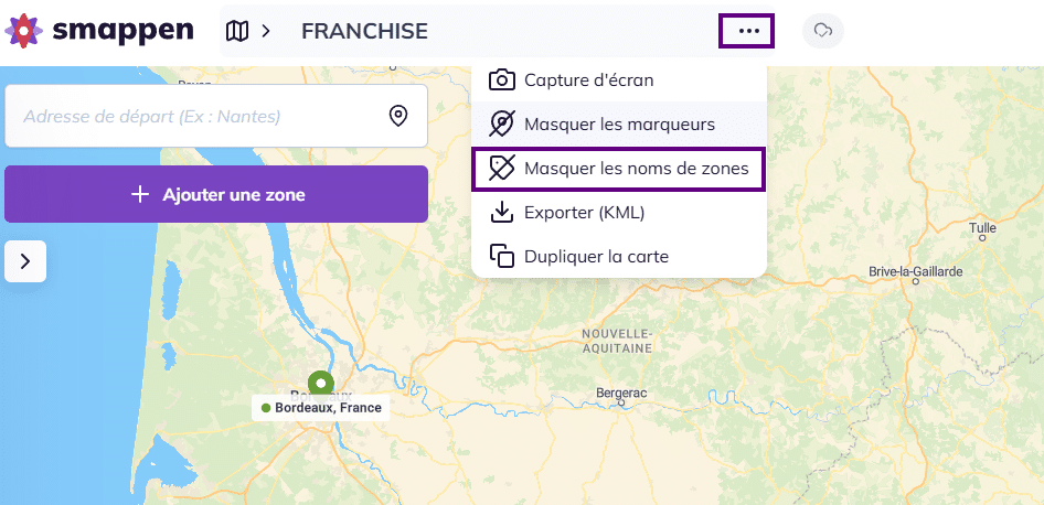 Par défaut, les marqueurs (pins) des zones et les noms des zones sont affichés sur votre carte. Vous pouvez les masquer ou les afficher selon vos besoins.